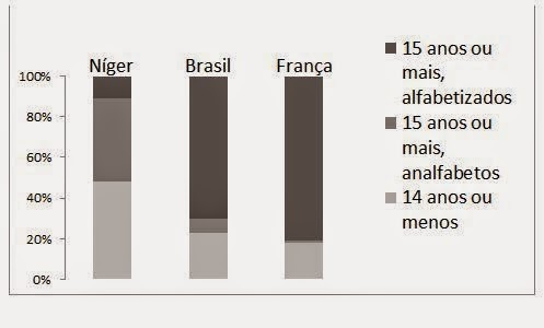 O Níger oferece um triste exemplo da dimensão que pode assumir a barbárie educacional. Quase a metade dos 18 milhões de nigerenses tem menos do que 15 anos de idade sendo, portanto, altamente demandantes de educação escolar. A outra metade é majoritariamente analfabeta: de cada 6 pessoas com 15 anos ou mais no Níger, apenas uma é alfabetizada. Portanto, qualquer esforço educacional que mobilizasse parte das pessoas alfabetizadas para a tarefa de educar pressionaria, de forma intolerável, outras atividades essenciais do país e que também dependem de pessoas escolarizadas. O gráfico de barras ilustra como se distribui a população no Níger bem como, para fins de comparação, no Brasil e na França. A proporção entre pessoas demandantes de educação escolar no Níger em relação à quantidade de pessoas entre as quais se poderia arregimentar educadores é assustadora. Evidentemente, países como o Níger, entre vários outros, não têm como escapar da barbárie educacional, pois não tem como escolarizar seus jovens e alfabetizar ainda que uma pequena parte de seus analfabetos.